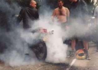 ognisko, sanitariaty, "polowy" warsztat, samochód z przyczepką motocyklową