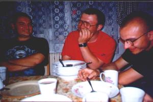 Ruszamy. Następny postój ma być w Kijowcu, koło Białej Podlaskiej. Jedziemy, mijamy Terespol, staramy się wybierać z mapy żółte trasy. Niestety, tu nas jednak dopadły ciągłe deszcze. Do tego, w Białymstoku zaczął siadać Junak "Sprytnego". Trasa przed nami jeszcze długa a tu "sprytmobil" cienko przędzie. Nie podoba mu się woda, czy co? Sytuacji zaradził spryt Sprytnego i odpowiednio użyta tablica rejestracyjna znaleziona w rowie. Gdy dojechaliśmy wreszcie do rodziny Tomka, wszyscy mieli szczękościsk z zimna a woda chlupała wewnątrz przeciwdeszczowych kombinezonów. Przyjęto nas gościnnie a zamiast wcześniej oferowanej stodoły dostaliśmy pokój na piętrze. A na rozgrzewkę coś mocniejszego!