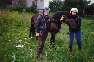 Garaż, zamiana pojazdów. Nasz zmodyfikowany Junak barwy jajecznicy, z jękiem przysiadł pod sakwami, plecakiem, workiem konserw, namiotem, śpiworem itd. Oczekując na resztę próbowaliśmy jakoś przewalczyć opór ekspandorów. Był Wiciu na Kaśce, "Sprytny" z Kaśką na Junaku, dojechał Robert - prezes z Tomkiem na oryginalnym Junaku, "Bobry" na Night Hawku, "Macek" z bagażami w koszu i my na Junaku. Do ostatniej chwili nie wiadomo kto pojedzie, kto dojedzie, a plan działania zakładał wyjazd do czeskiego Mostu na zawody motocykli weteranów. W drodze powrotnej nocleg, czeskie piwo i jazda do Zgorzelca, gdzie czeka reszta klubu.
