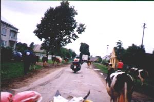 Spiskowa teoria dziejów została obalona. Przy pomocy rozciągniętych sznurków przepędzano krowy z jednego pastwiska na drugie. Widzieliśmy to także jadąc dalej, w stronę Gdańska. Koło Kołobrzegu Kaczorowi wysiadły prądy, potem dopadł nas lekki deszcz, kości dziwnie bolały a przypalone plecy piekły pod skórą. O zmierzchu znaleźliśmy wygodną i gościnną łąkę z pasącymi się krowami.
